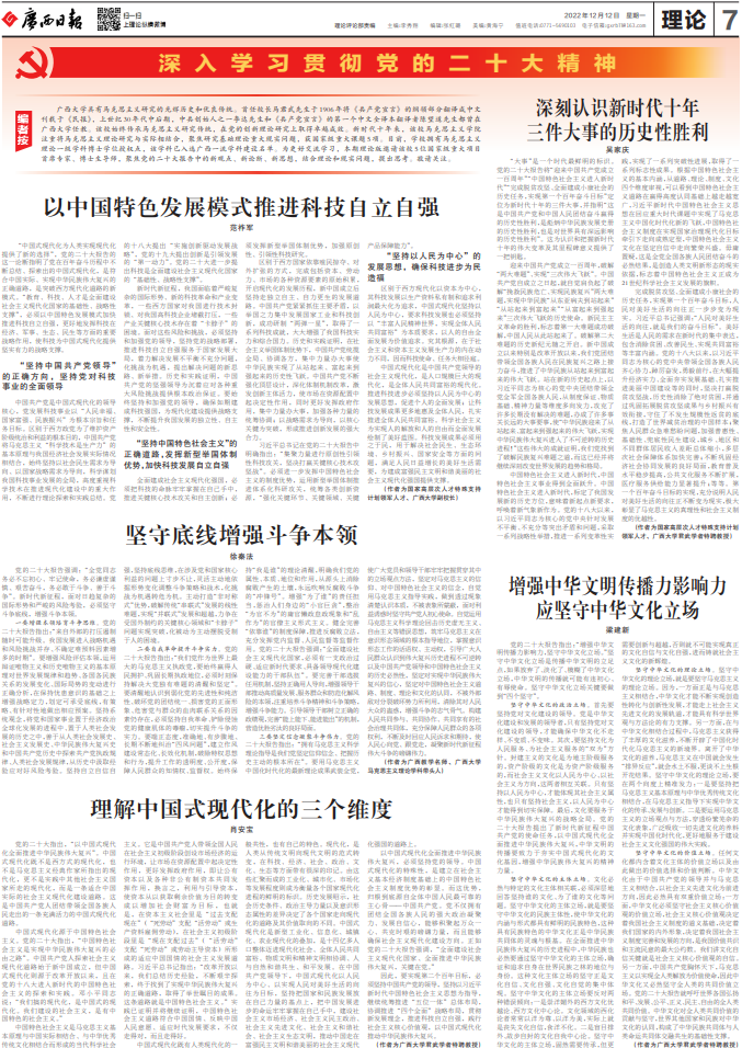 廣西大學(xué)具有馬克思主義研究的光輝歷史和優(yōu)良傳統(tǒng)。首任校長馬君武先生于1906年將《共產(chǎn)黨宣言》的綱領(lǐng)部分翻譯成中文刊載于《民報》,上世紀(jì)30年代中后期,中共創(chuàng)始人之一李達(dá)先生和《共產(chǎn)黨宣言》的第一個中文全譯本翻譯者陳望道先生都曾在廣西大學(xué)任教。該校始終傳承馬克思主義研究傳統(tǒng),在黨的創(chuàng)新理論研究上取得卓越成效。新時代十年來,該校馬克思主義學(xué)院注重將馬克思主義理論研究與實際相結(jié)合,聚焦研究基礎(chǔ)理論重大現(xiàn)實問題,獲國家級重大課題5項。目前,學(xué)校擁有馬克思主義理論一級學(xué)科博士學(xué)位授權(quán)點,該學(xué)科已入選廣西一流學(xué)科建設(shè)名單。為更好交流學(xué)習(xí),本期理論版邀請該校5位國家級重大項目首席專家、博士生導(dǎo)師,聚焦黨的二十大報告中的新觀點、新論斷、新思想,結(jié)合理論和現(xiàn)實問題,提出思考。敬請關(guān)注。