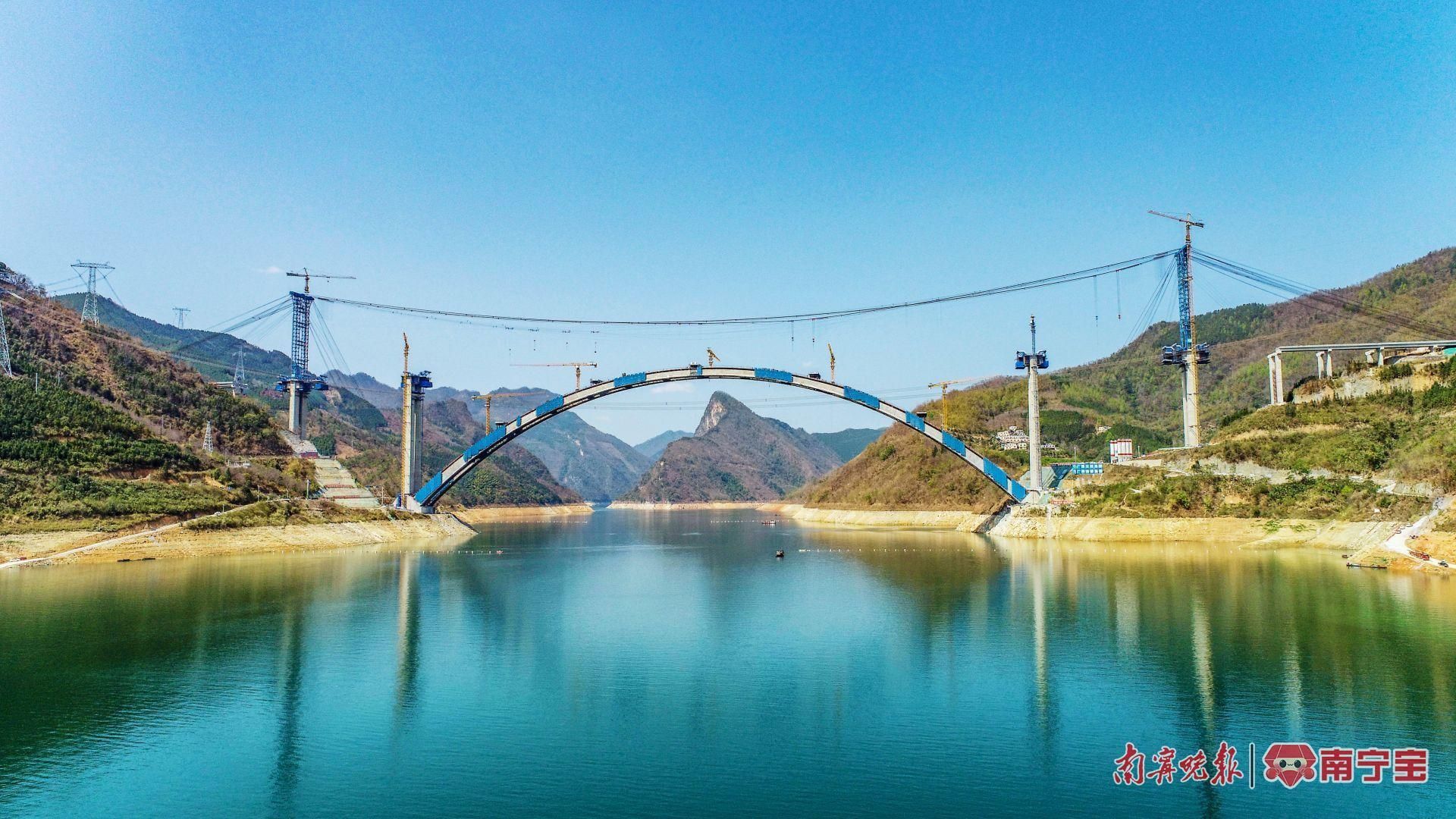 19日,記者在項目建設現(xiàn)場看到,在靜謐的紅水河上,兩岸青山之間,一座氣勢恢宏的大橋已經(jīng)芳容初露。據(jù)悉,目前大橋已完成勁性骨架吊裝合龍和管內(nèi)混凝土灌注施工,目前正在進行外包混凝土施工。廣西交通投資集團南丹至天峨下老高速公路工程建設指揮部指揮長黎水昌介紹,項目開工建設以來推進順利,大橋進度完成率約66%,預計今年年底建成通車。