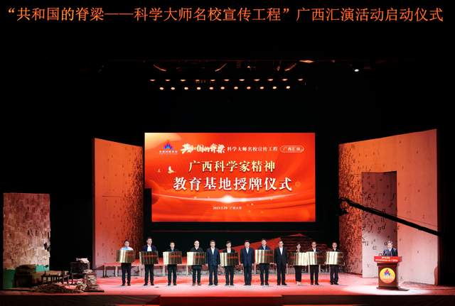 啟動儀式上,出席活動的領導為榮獲廣西科學家精神教育基地的單位授牌。廣西大學、廣西科技館(廣西青少年科技中心)等9個單位代表上臺接受牌匾。