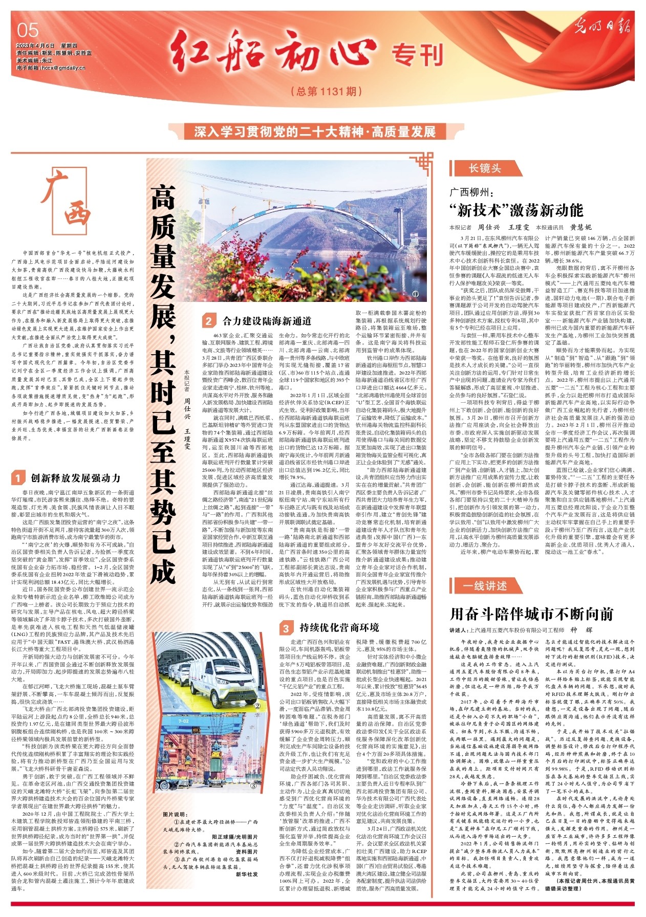 這是廣西經濟社會高質量發展的一個縮影。黨的二十大期間,習近平總書記在參加廣西代表團討論時,要求廣西在“推動邊疆民族地區高質量發展上展現更大作為,在服務和融入新發展格局上取得更大突破,在推動綠色發展上實現更大進展,在維護國家安全上作出更大貢獻,在推進全面從嚴治黨上取得更大成效”。