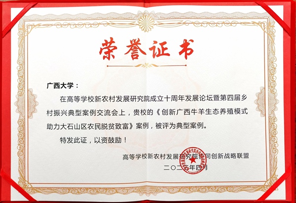 榮譽(yù)證書(shū)。廣西大學(xué)農(nóng)牧產(chǎn)業(yè)發(fā)展研究院供圖