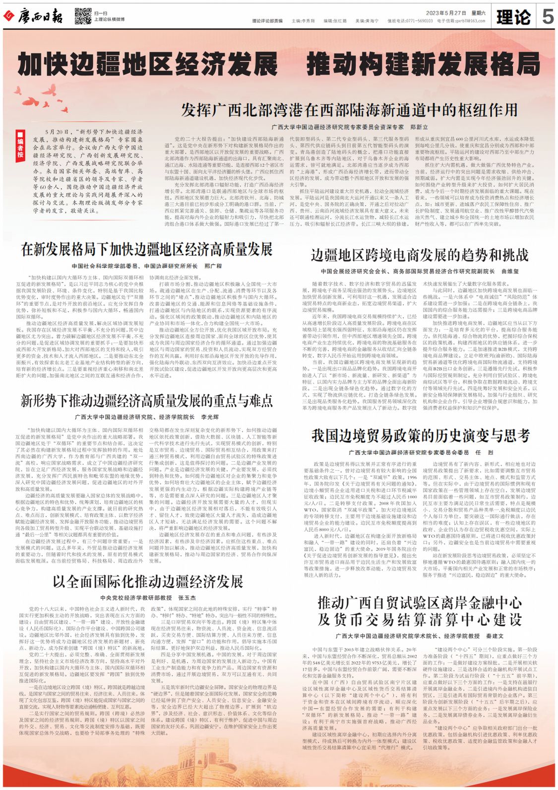 5月20日,“新形勢下加快邊疆經濟發展,推動構建新發展格局”專家圓桌會在北京舉行。會議由廣西大學中國邊疆經濟研究院、廣西創新發展研究院、經濟學院、廣西發展戰略研究院聯合舉辦。來自國家相關部委、高端智庫、高等院校和邊疆省區的領導及專家、學者等60余人,圍繞推動中國邊疆經濟開放發展的重大理論與實踐問題展開深入的探討與交流。本期理論版摘發部分專家學者的發言,敬請關注。