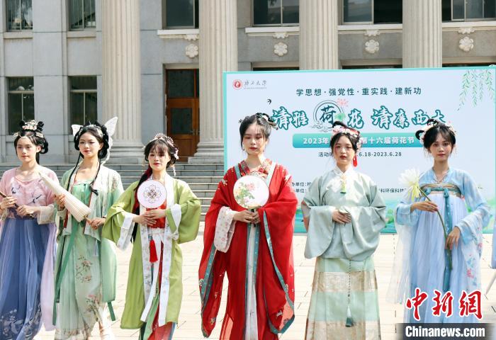 6月18日,廣西大學第十六屆荷花節開幕,學子身著漢服參加荷花主題走秀等活動。