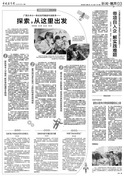 廣西多所中小學打破校園圍墻,跟上科技的前沿。2023年4月,在廣西壯族自治區科學技術協會指導下,南寧市天桃實驗學校集團成立科學技術協會,成為廣西唯一一家在校內成立的科學技術協會;南寧市星湖小學榮獲中國科協2022年“‘科創筑夢’助力‘雙減’科普行動”優秀單位……