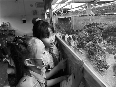 南寧市大學東路小學學生在廣西大學海洋學院島礁修復實驗室近距離參觀實驗室培育珊瑚。(廣西大學供圖)
