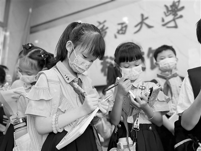 南寧市大學東路小學學生們在廣西大學土木建筑工程學院大型結構試驗研究平臺試驗大廳內認真記錄科學發現。(廣西大學供圖)