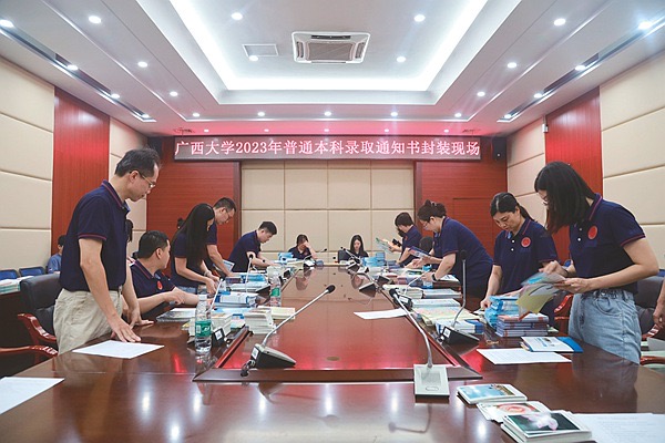 昨日9時(shí),廣西大學(xué)2023年第一批本科新生錄取通知書開始封裝,下午3時(shí)左右全部封裝完畢,3972份通知書當(dāng)晚通過郵政向全國錄取新生發(fā)出。地址在南寧市區(qū)的錄取新生最快今日上午就能收到。