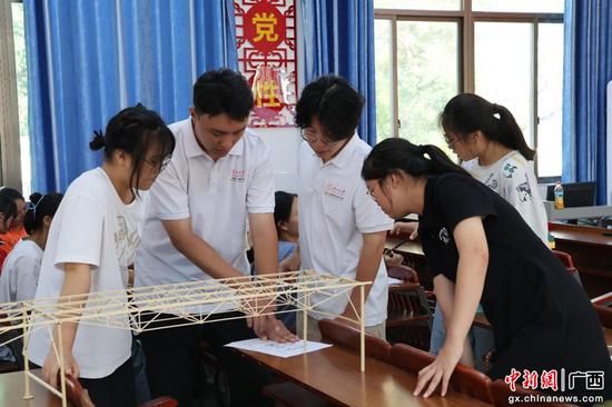 宣講團成員指導同學們搭建橋梁模型。廣西大學供圖