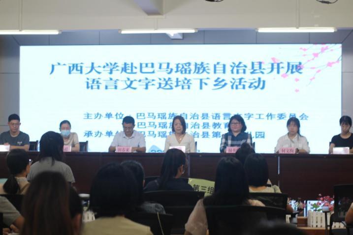 為深入學(xué)習(xí)貫徹落實黨的二十大“加大國家通用語言文字推廣力度”精神,推動實施國家通用語言文字普及提升工程,日前,國家語言文字推廣基地(廣西大學(xué))師生先后赴廣西壯族自治區(qū)河池市巴馬瑤族自治縣、鳳山縣、東蘭縣,開展語言文字送培下鄉(xiāng)活動及國家通用語言文字推廣普及工作調(diào)研,提高鄉(xiāng)村教師國家通用語言文字應(yīng)用能力和教學(xué)水平。