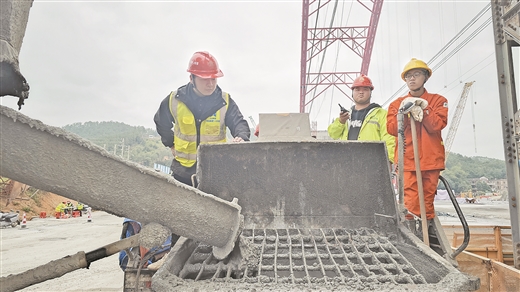 在校博士生與工作人員在平陸運河舊州特大橋施工現(xiàn)場,觀察管內(nèi)混凝土入泵狀態(tài)。廣西大學(xué)供圖