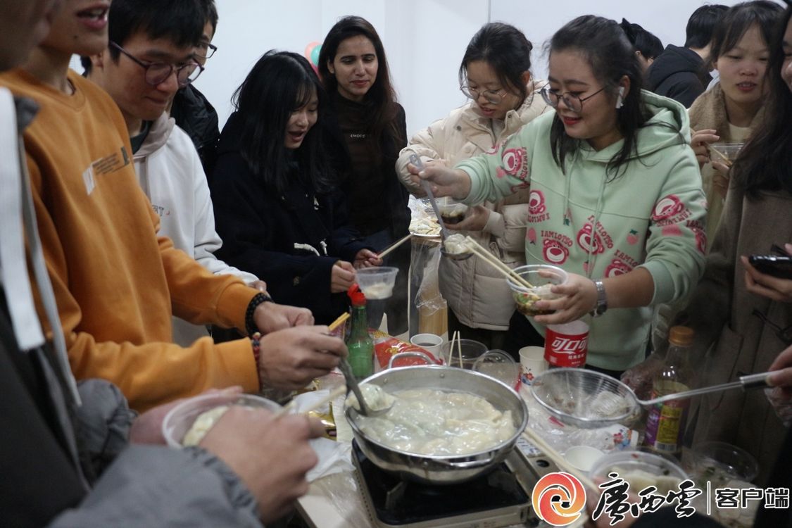 餃子香,情意濃,12月22日晚上,廣西大學在“一站式”學生社區組織開展以“情暖社區過冬至”為主題的傳統文化活動,吸引了全校上千名同學報名參與。自助生活室內,大家將一張張餃子皮攤在手心,再用筷子將餡料放在中間,合攏捏出花紋。待一碗碗熱氣騰騰的餃子出鍋上桌時,大家品嘗著美食,分享著喜悅,幸福洋溢在每個人的臉龐。現場歡聲笑語不斷,餃子香味四溢。