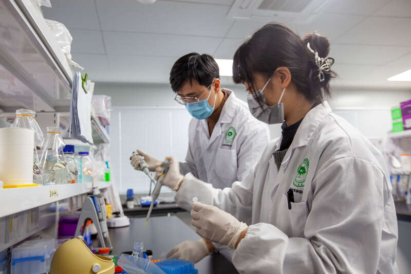 2月6日,廣西南寧,廣西大學亞熱帶農業生物資源保護與利用國家重點實驗室,研一學生藍渝泓(右)與博一學生汪柏宇(左)正在使用移液槍轉移液體。他們研究的方向都是甘蔗遺傳育種。藍渝泓因實驗進行到關鍵階段推遲了回家,汪柏宇因為前段時間剛回過家而選擇留校過年。江暢/攝