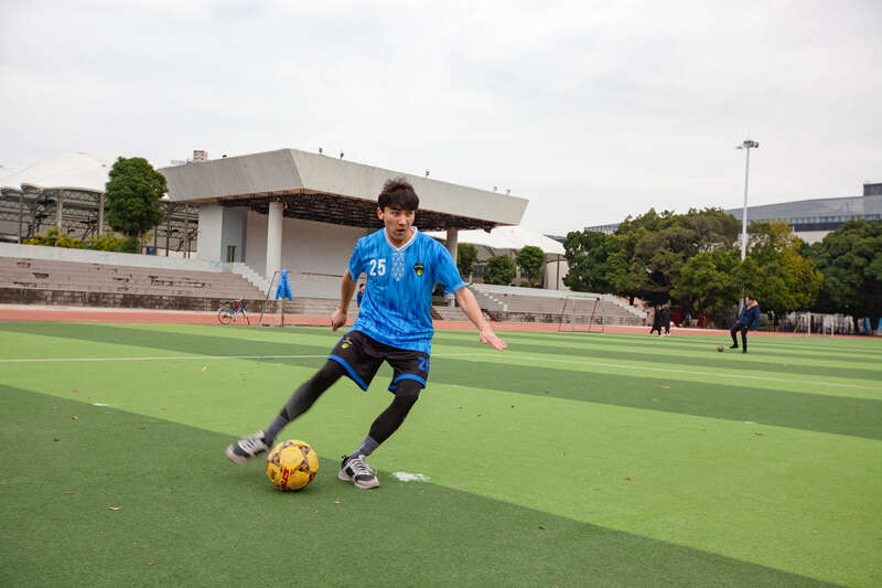 2月8日,廣西南寧,23歲的阿西木江·買買提在操場踢球。他來自新疆喀什,退伍后在廣西大學新聞與傳播學院學習新聞學,今年大三。他保持著每天鍛煉的習慣,最喜歡的運動是足球,最喜歡的明星是C羅。他說以前回新疆要坐5天綠皮火車,現在縮短為70多小時。他打算在這個假期拿下駕照,就留在了學校。江暢/攝