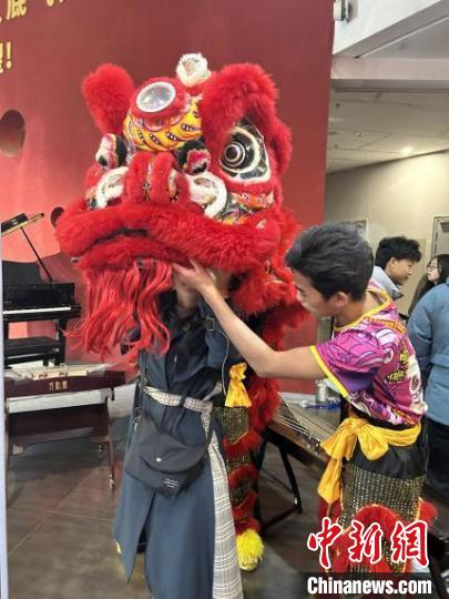 圖為廣西大學(xué)舞獅表演者在指導(dǎo)日本青年田村雙葉學(xué)習(xí)舞獅。汪冰雪 攝