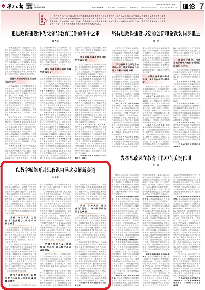 今年是習近平總書記主持召開學校思想政治理論課教師座談會五周年。五年來,各級各類學校深入學習貫徹習近平總書記重要講話精神,思政課發展環境和整體生態發生全局性、根本性轉變。近日,習近平總書記作出重要指示強調,不斷開創新時代思政教育新局面,努力培養更多讓黨放心、愛國奉獻、擔當民族復興重任的時代新人。本期理論版刊發廣西大學馬克思主義學院四位專家學者的文章,分享大思政教育的理論創新和實踐探索成果。
