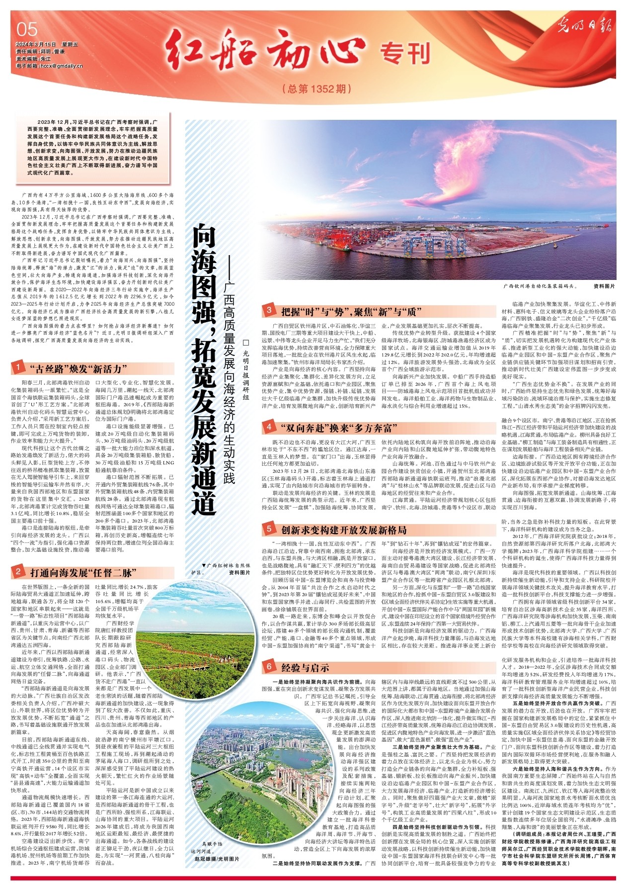 一是始終堅(jiān)持凝聚向海共識作為前提。向海圖強(qiáng),重在突出創(chuàng)新求變謀發(fā)展、凝聚各方發(fā)展共識。廣西牢記總書記囑托,引導(dǎo)全區(qū)上下拓寬向海視野、凝聚向海共識、強(qiáng)化向海思維,進(jìn)一步關(guān)注海洋、認(rèn)識海洋、經(jīng)略海洋,以思想觀念更新激發(fā)高質(zhì)量發(fā)展的澎湃動(dòng)能。出臺加快發(fā)展向海經(jīng)濟(jì)推動(dòng)海洋強(qiáng)區(qū)建設(shè)的系列政策及配套措施,接續(xù)實(shí)施兩輪向海經(jīng)濟(jì)三年行動(dòng)計(jì)劃,匯聚起向海圖強(qiáng)的強(qiáng)大政策合力。通過建立一批海洋科普教育基地,打造高品質(zhì)海洋周、海洋節(jié)、開海節(jié)、向海經(jīng)濟(jì)大講壇等海洋特色活動(dòng),營造全區(qū)上下向海發(fā)展的濃厚氛圍。