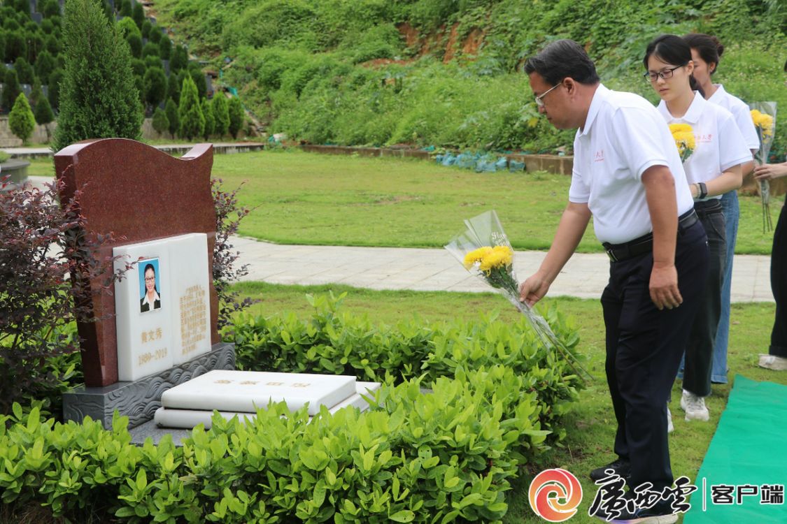 師生們依次為黃文秀同志敬獻(xiàn)鮮花、寄托哀思。 學(xué)院供圖