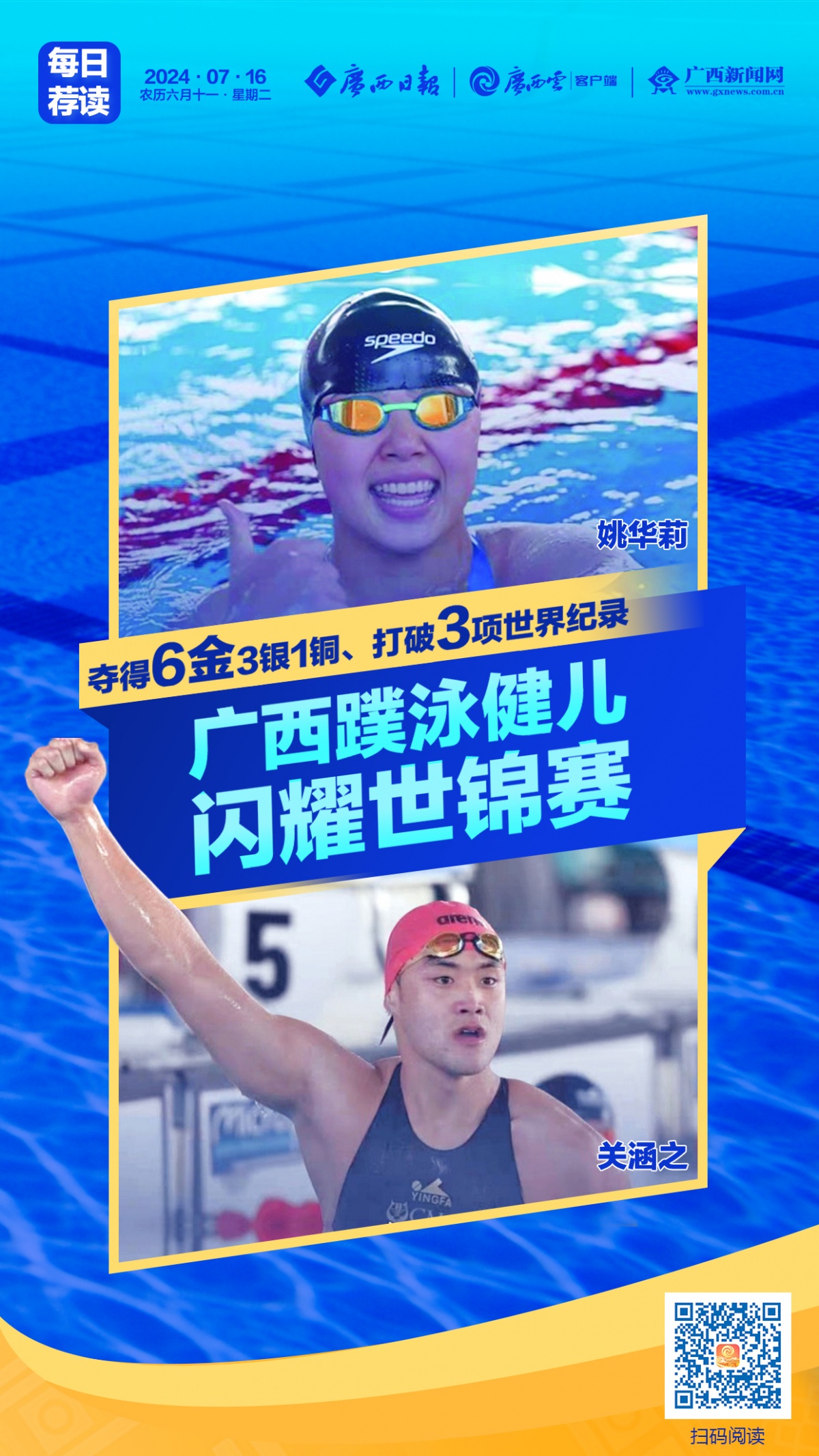 廣西健兒還奪得男子200米器泳項目金牌。比賽中,關涵之在折返轉身時意外發生肩關節脫臼,但他沒有輕言放棄,最終游出了1分12秒86并率先“撞線”,意外打破了1分13秒58的原世界紀錄,為中國隊收獲了一枚成色十足的金牌。