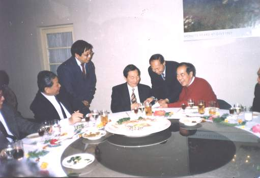 李政道(右一)請(qǐng)鄭志鵬(右二)向朱镕基(右三)匯報(bào)τ—c工廠可行性研究設(shè)想。