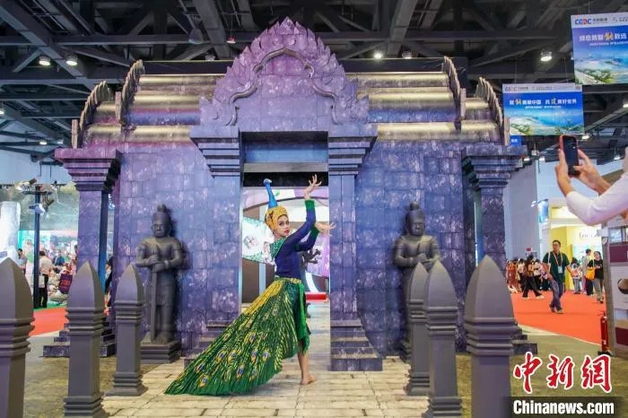 9月26日,第21屆中國—東盟博覽會上演員在柬埔寨暹粒省展位的“吳哥窟”起舞。陳冠言 攝