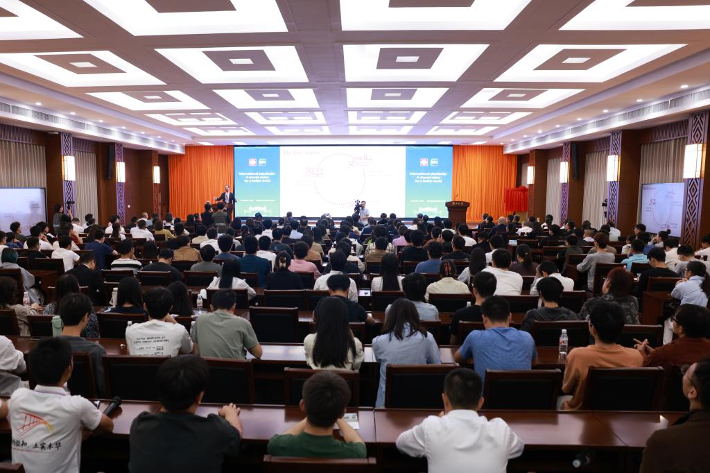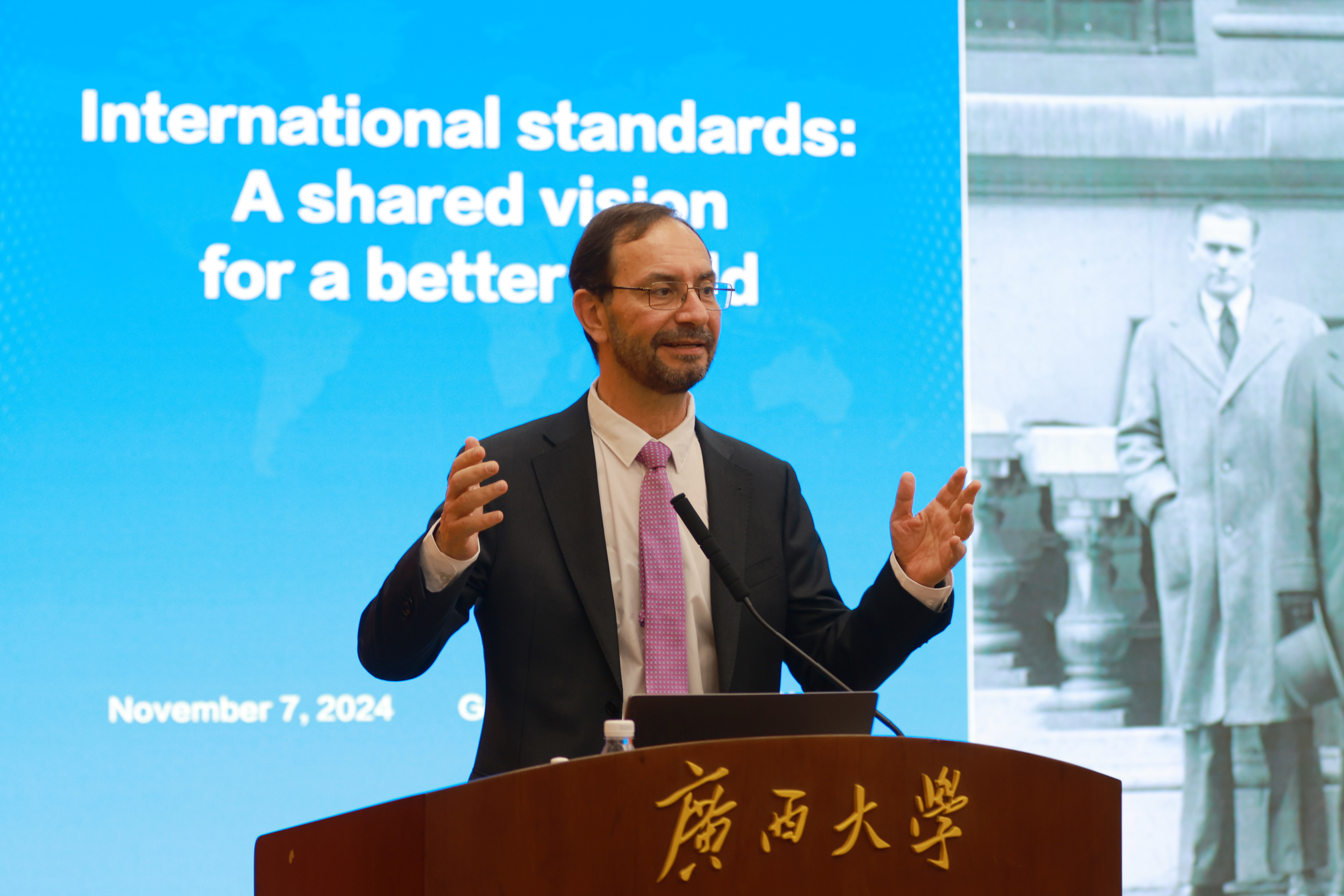 揭牌儀式前,穆希卡為廣西大學(xué)等高校的200余名師生代表作題為“國際標(biāo)準(zhǔn):為了一個更美好的世界的共同愿景”的主旨演講,并與活動現(xiàn)場師生代表就如何參與ISO國際標(biāo)準(zhǔn)制定、國際標(biāo)準(zhǔn)化人才培養(yǎng)、標(biāo)準(zhǔn)化在減少碳排放方面的貢獻等話題進行交流互動。