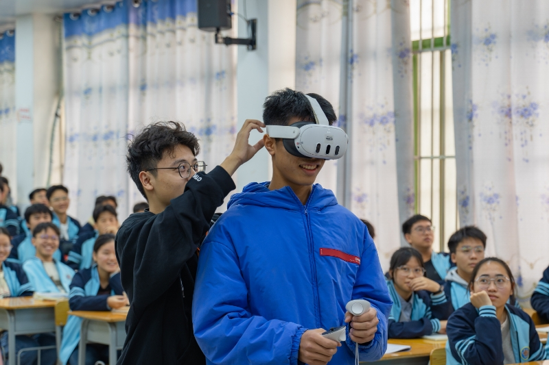 在都安瑤族自治縣高中和職業教育中心,廣西大學農學院副教授唐小付分享了其20余年的農業科研實踐經驗。他用親身經歷鼓勵學生扎根基層投身鄉村振興,傳遞科學精神和力量;以“00后”青年學生為成員的科探啟航宣講工作室通過青年故事分享、科學知識問答和表演說唱科學家精神等創新方式,激發了現場學生的科學熱情;中國傳媒大學教授付程和廣西大學教授李朝珍通過普通話推廣活動,引導中學、高中學生正確發音、流利表達;廣西大學電氣工程學院師生以此次活動為契機,宣傳普及了機器人與人工智能知識,通過編程游戲和VR體驗激發學生們的科學興趣。