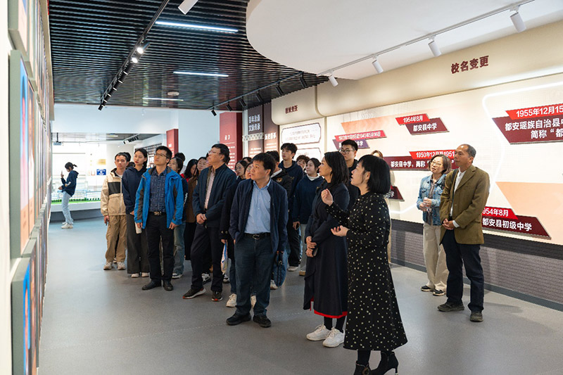 在都安高中校史館,實踐團在都安高中校長助理韋顯桃的講解下了解校史,從沙盤俯瞰校園布局,到聆聽校名更迭、名師事跡的故事,感受都安高中“全面發展,追求一流,讓瑤寨兒女走向世界”的辦學理念和“壯志都高,超越夢想”的都高精神。