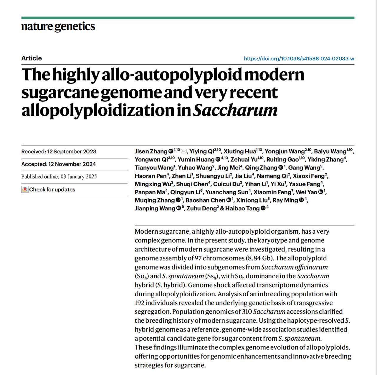 該成果的重要部分《現(xiàn)代栽培甘蔗的高倍體復(fù)雜基因組與近期異源多倍演化》已于1月3日在國際權(quán)威學(xué)術(shù)期刊《自然遺傳學(xué)》(Nature Genetics)雜志發(fā)表。