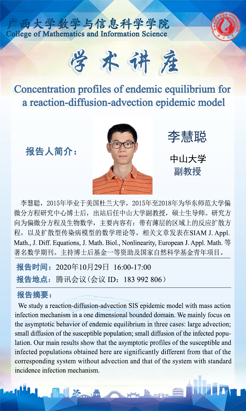 數(shù)學(xué)與信息科學(xué)學(xué)院學(xué)術(shù)講座:Concentration profiles of endemic equilibrium for a reaction-diffusion-advection epidemic model