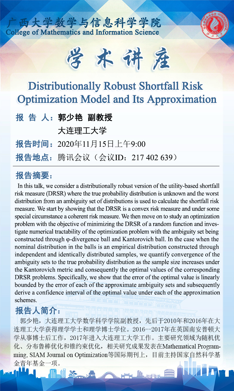 數學與信息科學學院學術講座:Distributionally Robust Shortfall Risk Optimization Model and Its Approximation