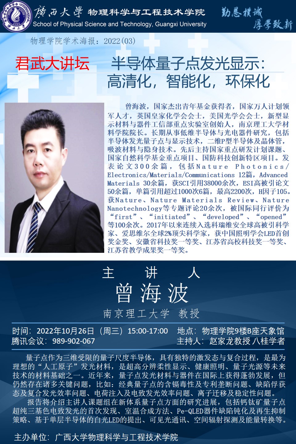君武大講壇物理科學與工程技術學院學術報告 半導體量子點發光顯示:高清化,智能化,環保化