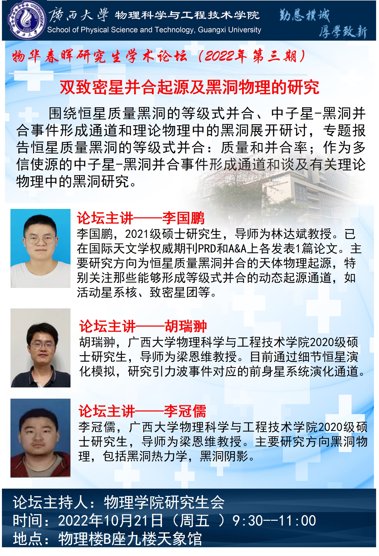 主講人 李國鵬 胡瑞翀 李冠儒 地址 物理學院9樓B座天象館