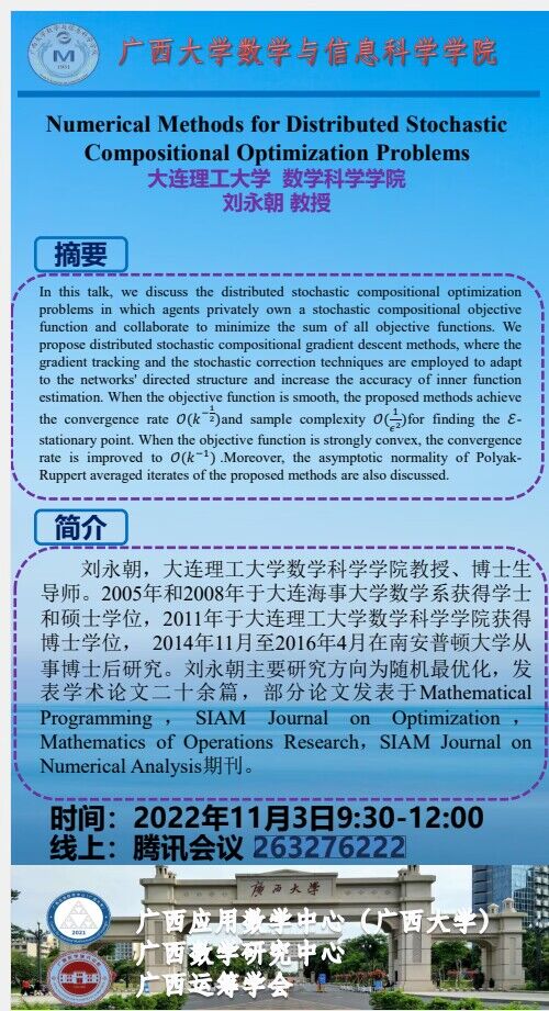 數(shù)學(xué)與信息科學(xué)學(xué)院/廣西應(yīng)用數(shù)學(xué)中心(廣西大學(xué))學(xué)術(shù)報(bào)告:Numerical Methods for Distributed Stochastic Compositional Optimization Problems