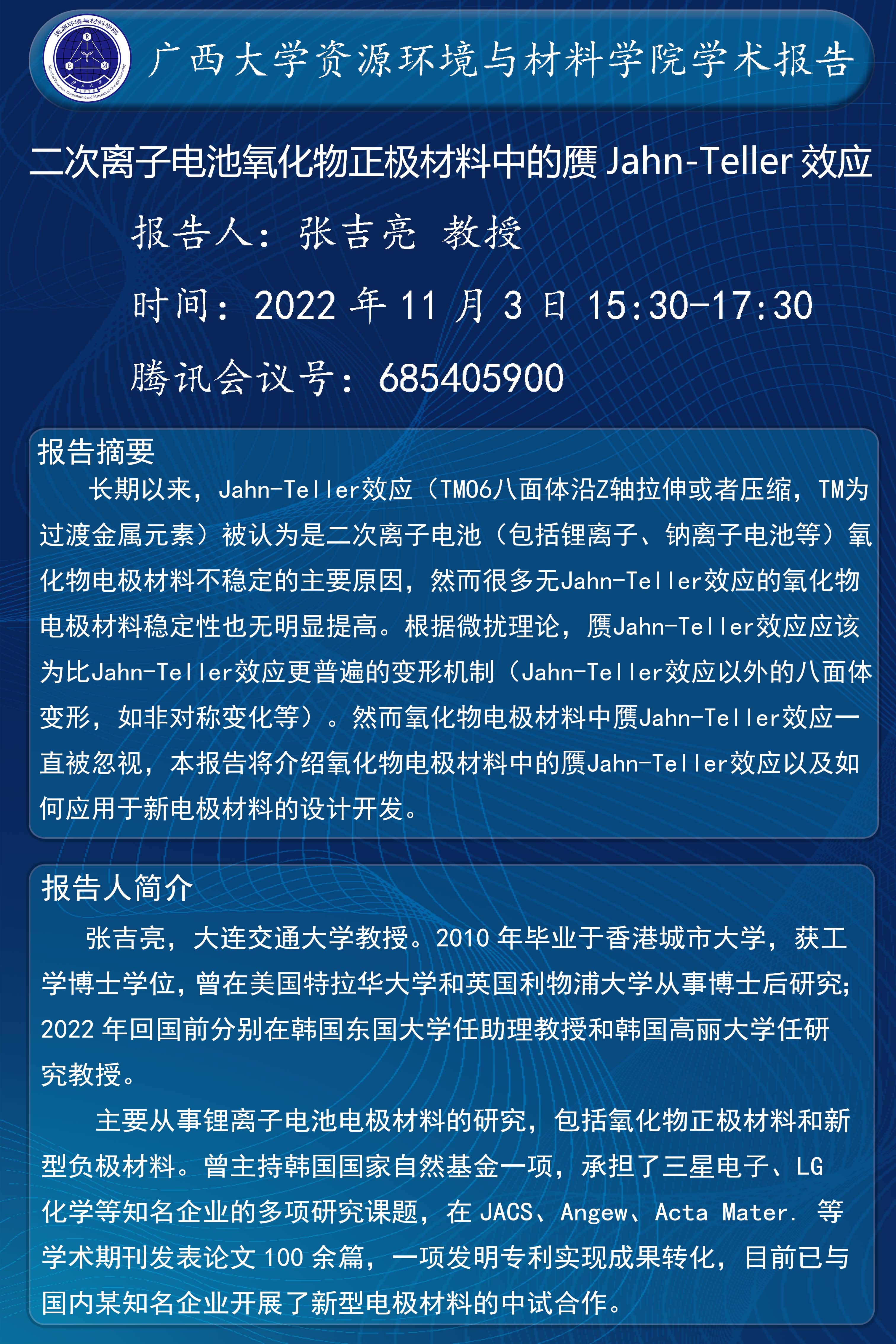 資源環(huán)境與材料學(xué)院學(xué)術(shù)報(bào)告:二次離子電池氧化物正極材料中的贗Jahn-Teller效應(yīng)
