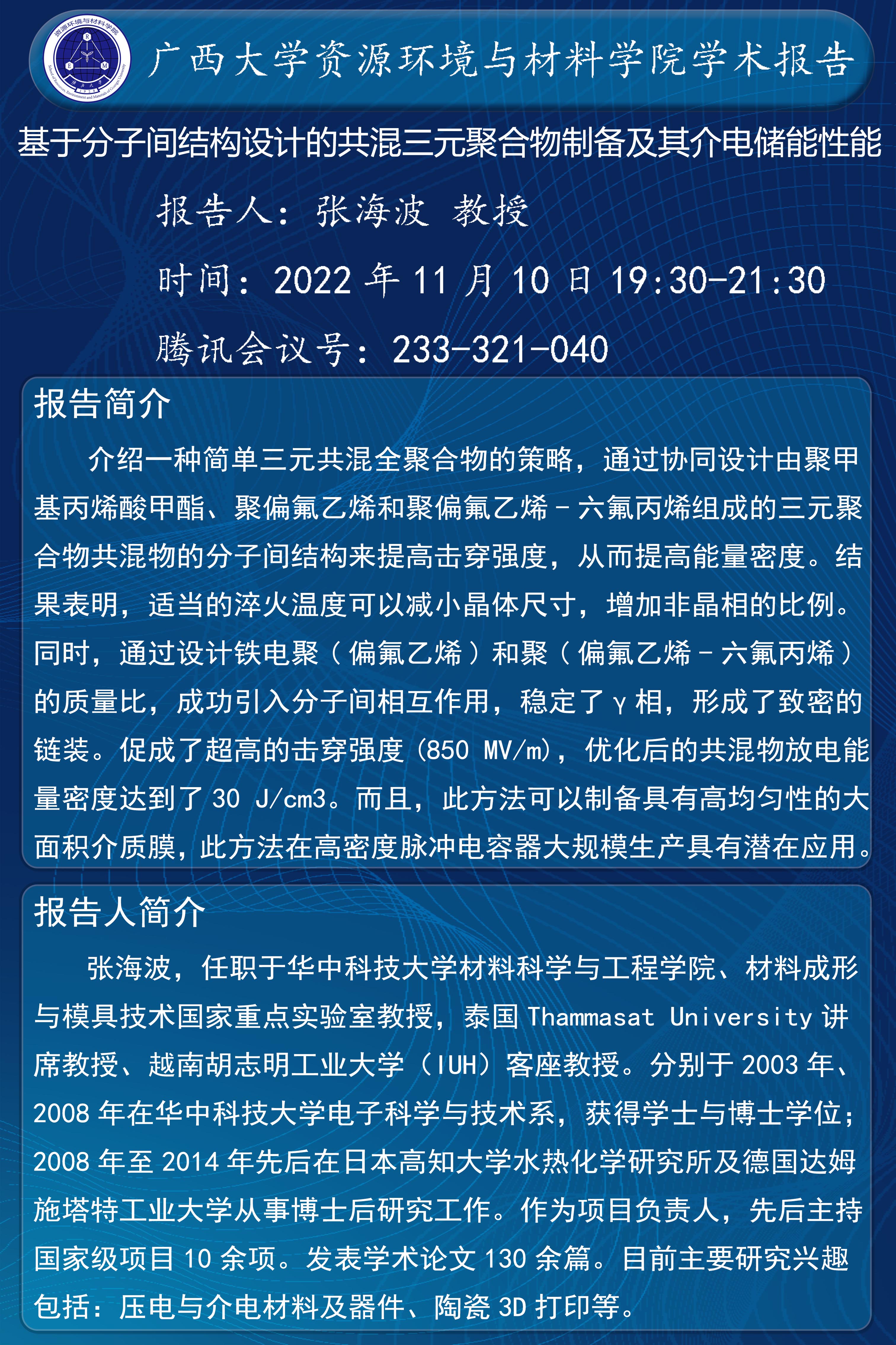 資源環(huán)境與材料學院學術報告:基于分子間結構設計的共混三元聚合物制備及其介電儲能性能