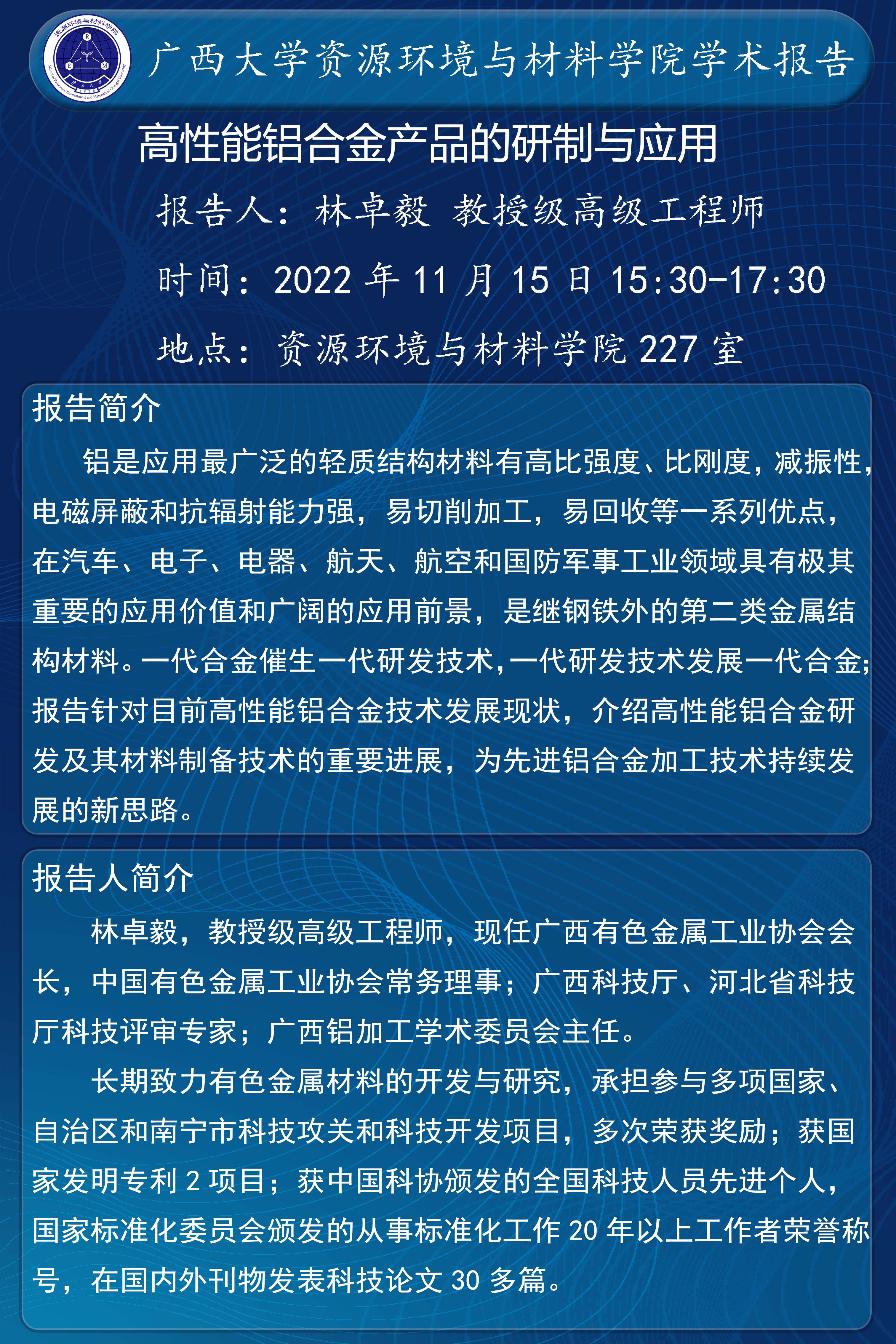 資源環(huán)境與材料學(xué)院學(xué)術(shù)報(bào)告:高性能鋁合金產(chǎn)品的研制與應(yīng)用