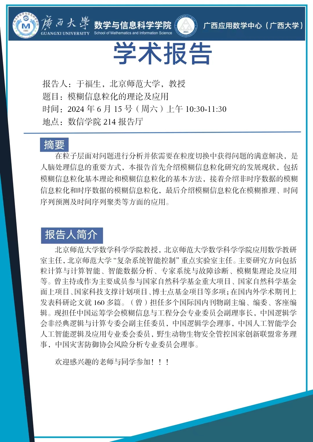 主講人 于福生 北京師范大學(xué)教授 地址 數(shù)信學(xué)院214報(bào)告廳